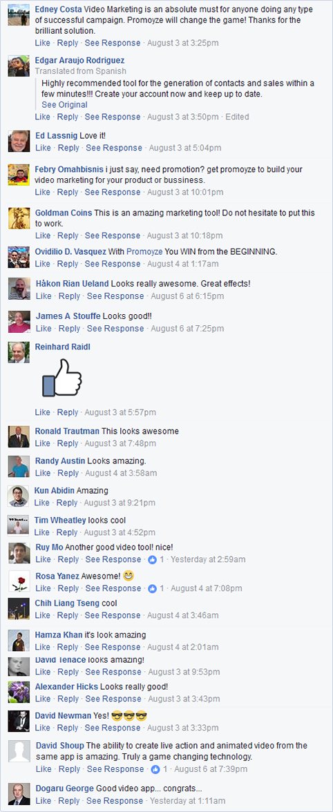 People love Promoyze not only for amazing marketing videos it creates, but also because it is so easy to use that even complete newbie can make great looking videos in minutes.